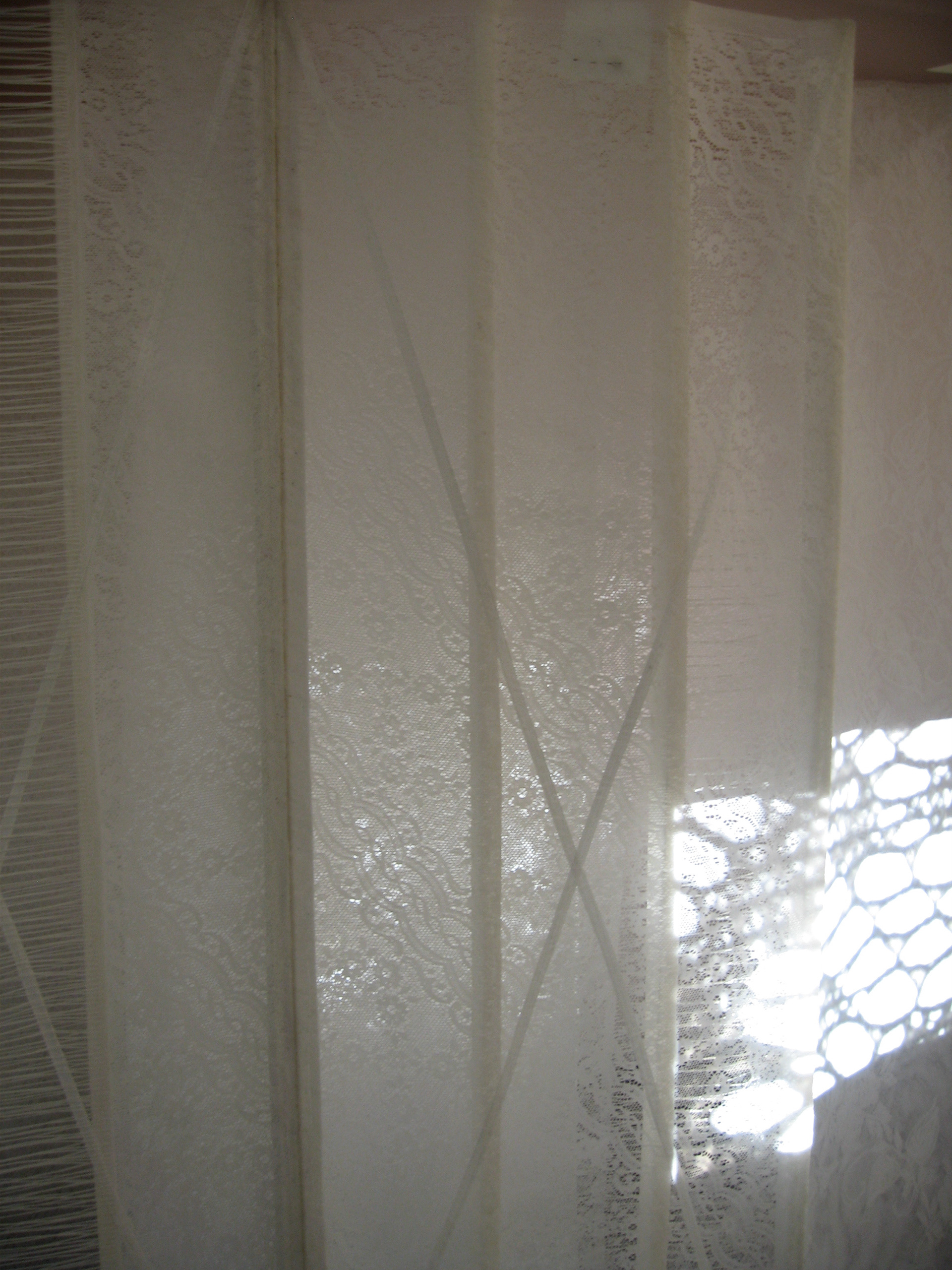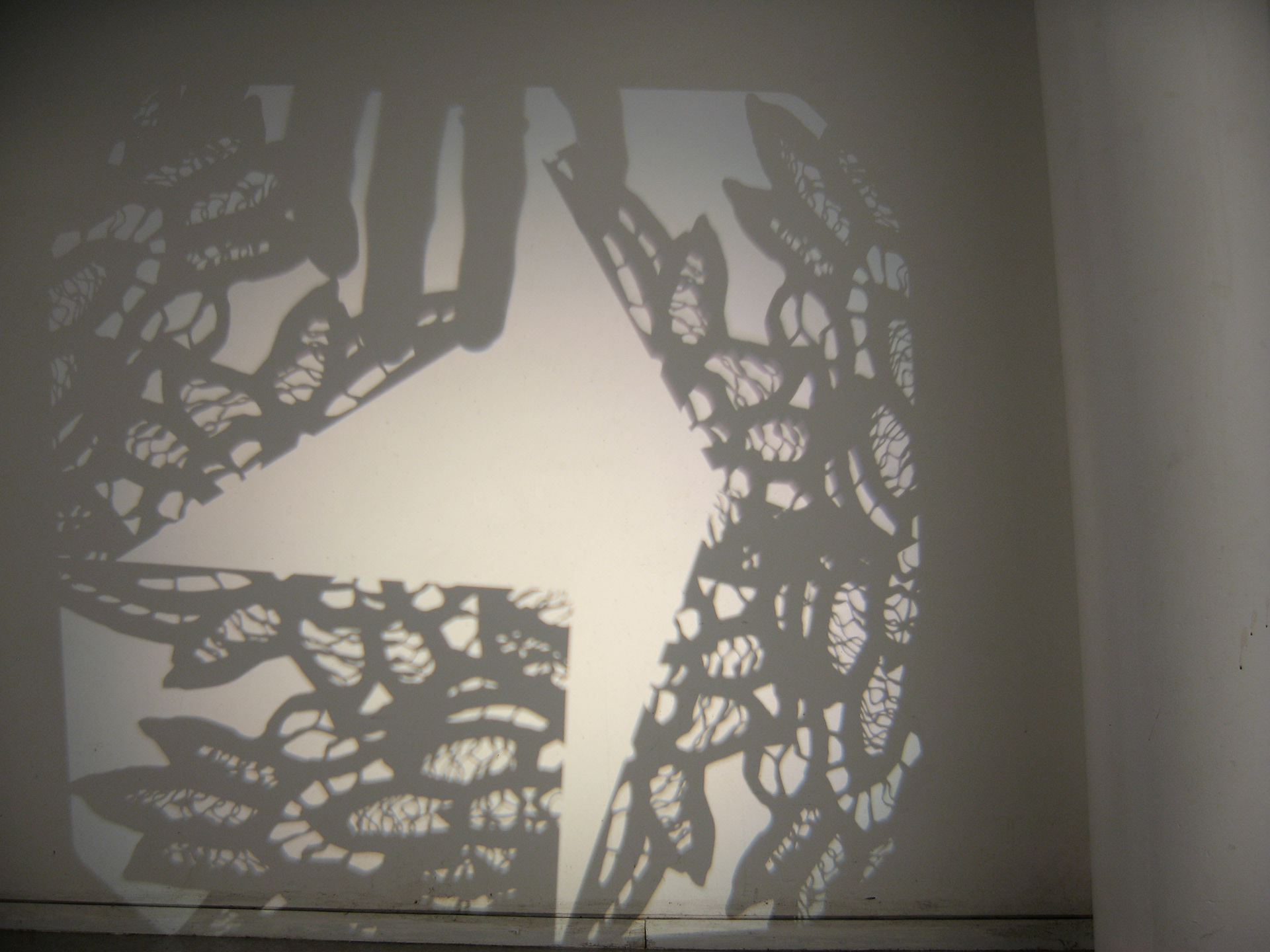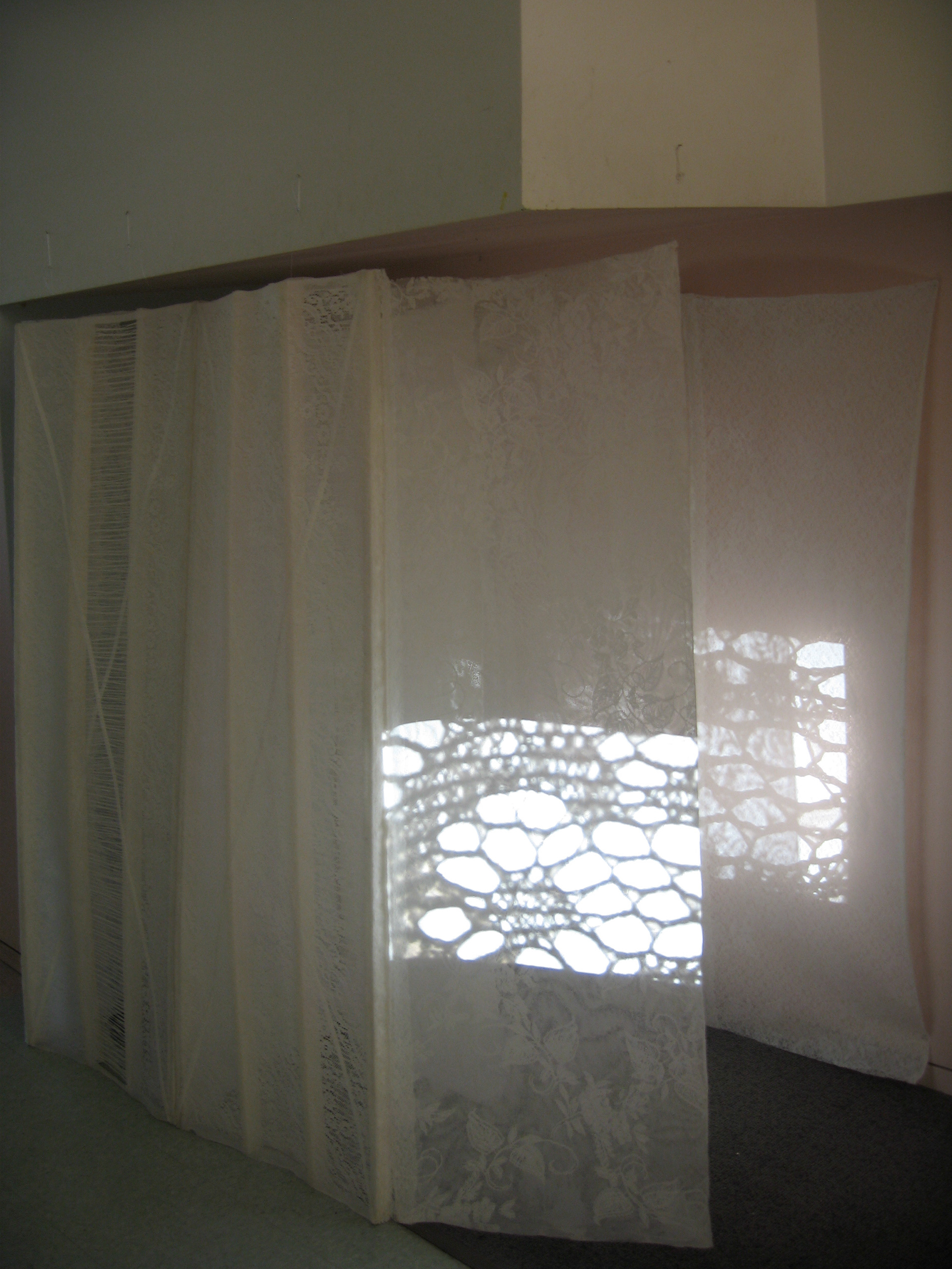 L A C E H O U S E The Changing Room attempts to subvert spatial and material dualisms. Public/private, inside/outside, masculine/feminine, and hard/soft are normally viewed in opposition. This thesis aims to use the constraint of dichotomy as a source for invention. Fabric, explored as structure, blurs the edges of dualist assumptions. This hybrid space is at once hard and soft, public and private, blurring and merging gender and material boundaries. T H E C H A N G I N G R O O M Projected fabric swatches illuminate various fabric casts- hard pillows, cellulite surfaces and lace bricks. The installation acts as an exhibition, revealing, masking and concealing gender space issues. WA L L P A P E R Experimental lace cut work installation in DAAP, Design, Art, Architecture and Planning wall. Fabric, paper, rubber, and sound board laser cut and assembled with different repetitions. Interactive light wallpaper.